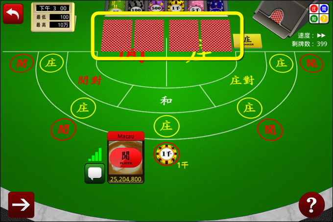 最初时,会发4张牌,以闲家-庄家-闲家-庄家的顺序各发2张。