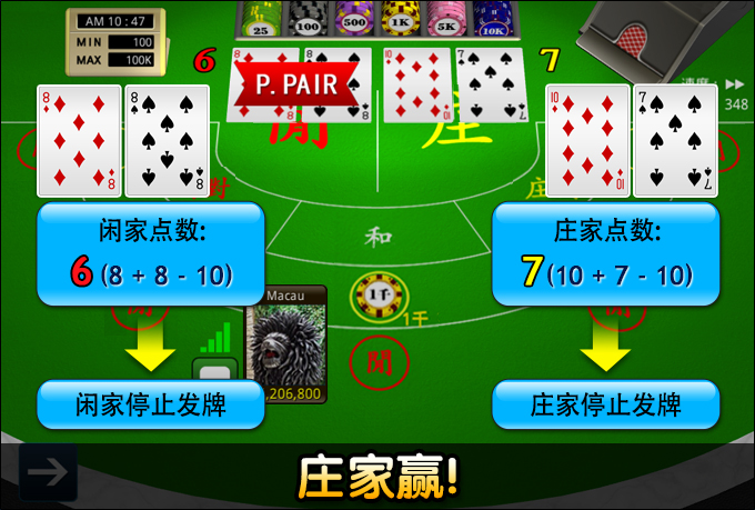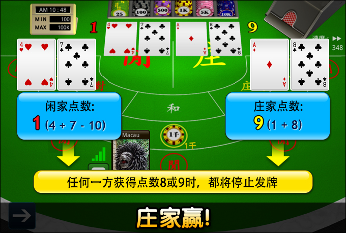 每个玩家可以选择在闲家(Player)或庄家(Banker)的任何一方下注,并且点数总和接近9的一方为胜。所有下注的获胜方都将获得1比1的赔彩,但由于庄家有着更好的获胜几率,因此庄家获胜时,会收取5%的手续费。