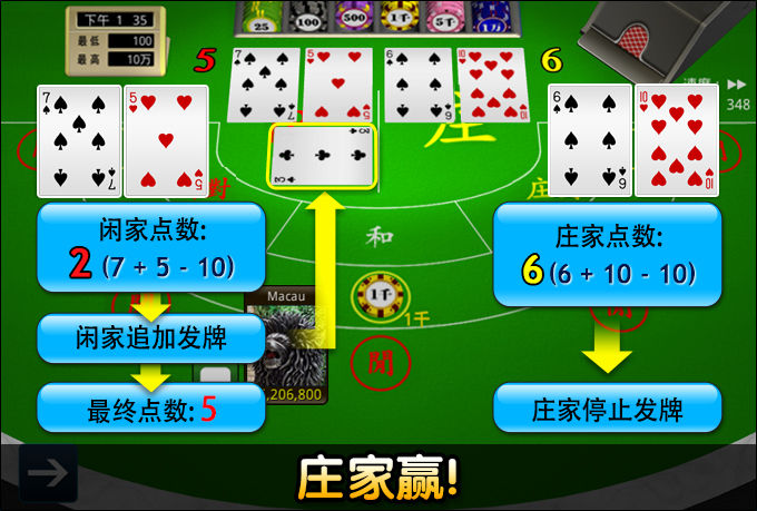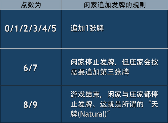 最初发牌结束后,荷官会根据当前点数总和的情况,判断是否追加发牌。