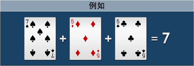 2至9的所有纸牌点数都按标识的数字计算,而纸牌A的点数计算为1,纸牌10与图片纸牌的点数计算为0。
