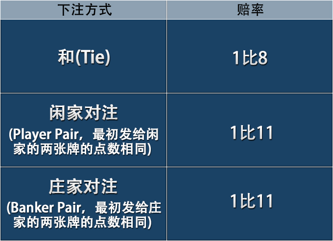 除了在闲家或庄家下注方式外,还有其他的下注方式,如: