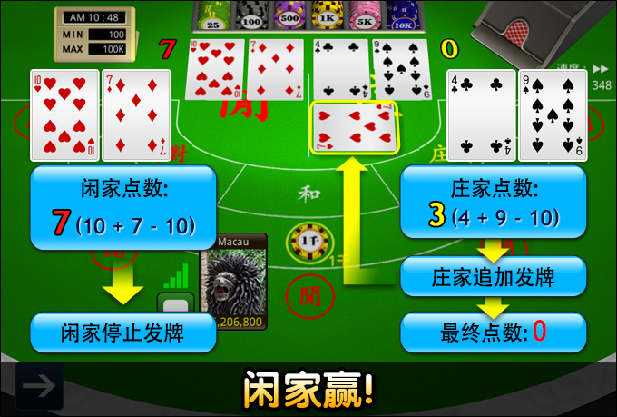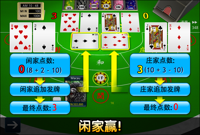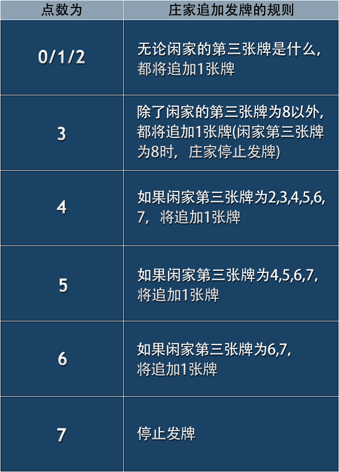 如果闲家停止发牌(假设他的点数总和为6或7),庄家的追加发牌只取决于自己纸牌的点数,并以与闲家相同的规则进行追加发牌(0至5时,追加发牌;6或7时,停止发牌)。