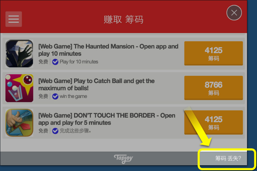 在本游戏中的TapJoy是当玩家按照相应步骤完成对应内容后,给玩家们提供免费筹码的广告联营伙伴。从而,本游戏对TapJoy所提供的内容与报酬是没有干预权限的。