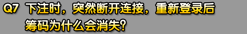 在本游戏中,是不会无故使玩家的筹码消失的。然而您在游戏中突然断开连接,则会以如下方式进行处理。 您的下注信息被传达到服务器时, 如果您在下注后或游戏中突然断开连接,则游戏会根据您的下注信息在服务器中继续进行,此时,会根据游戏的结果,您的筹码会有相应的增加或减少。 您的下注信息未传达到服务器时, 如果您在下注前突然断开连接,则服务器会将您判断为“通过”的状态。此时,无论游戏结果如何,您的筹码都不会有变动。